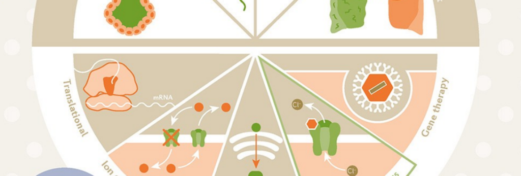Cystic fibrosis. Cystic fibrosis is caused by mutations in cystic fibrosis transmembrane conductance regulator (CFTR), which encodes a transmembrane ion channel on epithelial cells. Many therapies are under investigation to treat patients with cystic fibrosis, including ion channel modulators and gene therapy.
