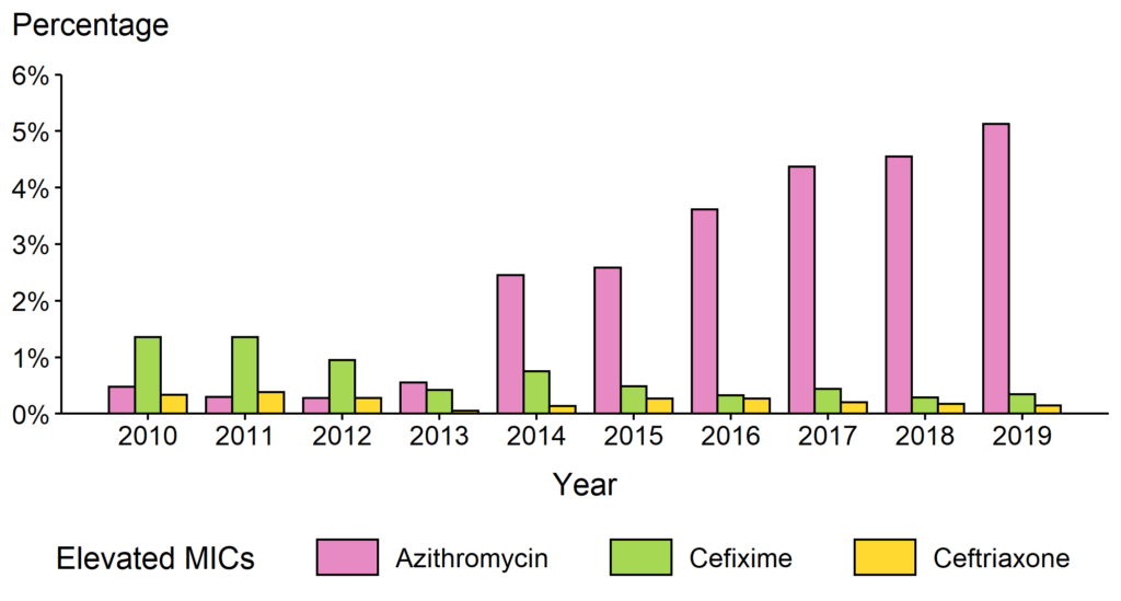 Resistant Neisseria gonorrhoeae. Percentage of Isolates with Elevated Minimum Inhibitory Concentrations (MICs) to Azithromycin, Cefixime, and Ceftriaxone, Gonococcal Isolate Surveillance Project (GISP), 2010–2019 . SOURCE: CDC.