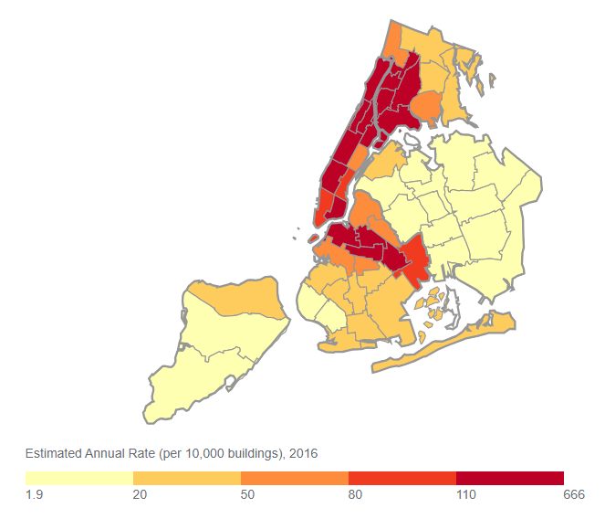Number of carbon monoxide incidents in an area, where FDNY measured at least 1 ppm at the scene, divided by the number of buildings in the area; expressed as incidents per 10,000 buildings. SOURCE: NYC Health