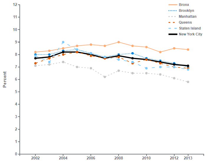 Number of live, singleton births occurring at less than 37 weeks gestation among residents of an area, divided by the number of live, singleton births. SOURCE: NYC Health