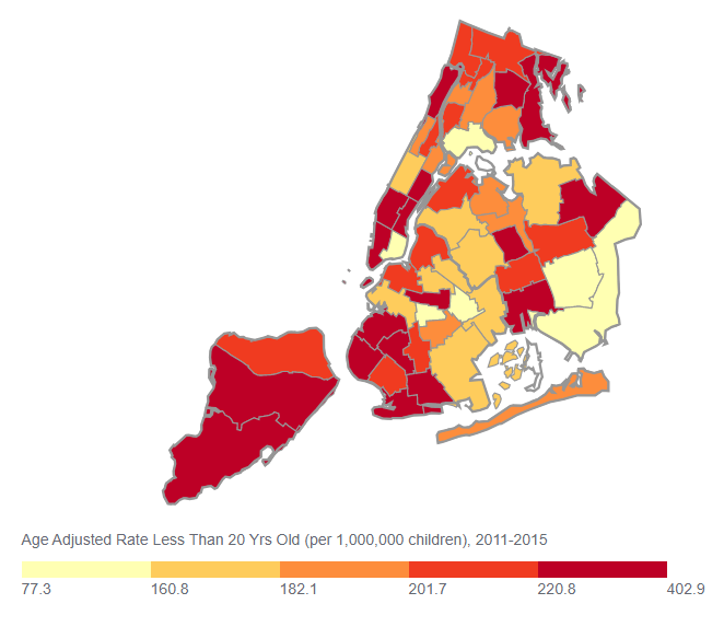 Average annual number of resident children, less than 20 years old, diagnosed with cancer over the 5 year period, divided by the corresponding age-specific intercensal population estimates. SOURCE: NYC Health