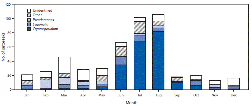 Number of outbreaks associated with treated recreational water (N = 493), by etiology and month — United States, 2000–2014. SOURCE: MMWR