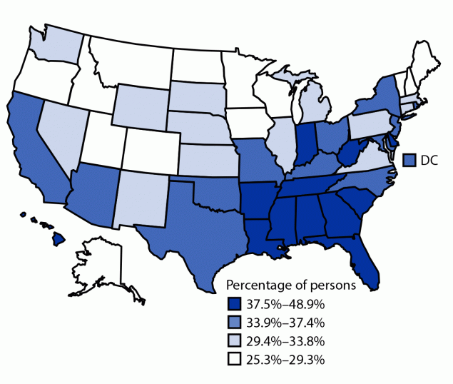 Prevalence of short sleep duration among persons aged 4 months–17 years, by state — National Survey of Children’s Health, United States, 2016–2018. “Short sleep” duration is defined as <12 hours for infants aged 4–11 months, <11 hours for children aged 1–2 years, <10 hours for children aged 3–5 years, <9 hours for children aged 6–12 years, and <8 hours for adolescents aged 13–17 years.