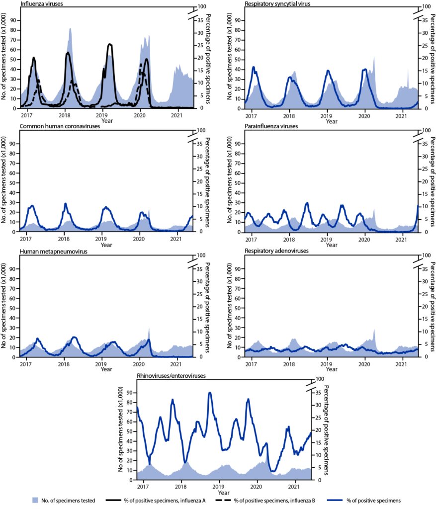 Number of specimens tested and the percentage of positive tests for influenza viruses, respiratory syncytial virus, common human coronaviruses, parainfluenza viruses, human metapneumovirus, respiratory adenoviruses, and rhinoviruses/enteroviruses, by year — United States, 2016–2021.